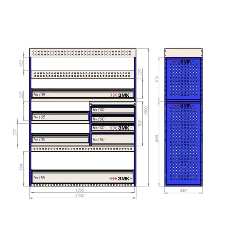Комплект ЗМК 13.14.1600.1240.440 предназначен для комплексного оснащения сервисных автомобилей системой хранения инструмента с целью осуществления выездного сервиса, монтажа или ремонта. Используется в организациях, занимающихся ремонтом сельскохозяйственной и погрузочной техники, дорожно-ремонтных служб и других. Все элементы стеллажей изготовлены из высококачественной стали толщиной 1 мм. Рамы из профильной стальной трубы квадратного сечения 20х20 мм имеют порошковое полимерное покрытие синего цвета. Все выдвижные ящики, дверные блоки и откидные крышки оснащены специальными фиксаторами, которые не позволяют им выдвигаться и открываться при движении автомобиля. Шаг отверстий для крепления составляет 52 мм. Перфорированные стенки стеллажа позволяют фиксировать с помощью резиновых креплений вспомогательный инструмент или оборудование. Допустимая нагрузка на все ящики до 35 кг, на все полки до 50 кг, на столешницы до 100 кг. В комплект стеллажа входят все необходимые метизы, фиксаторы, кронштейны и усилители. Они поставляются в разобранном виде в надежной упаковке.