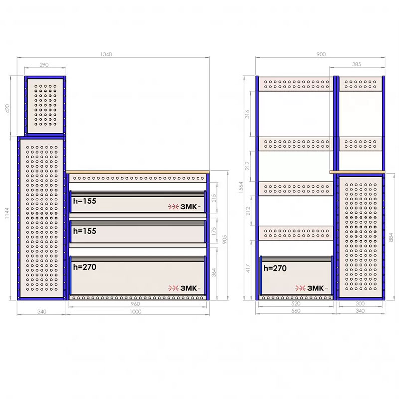 Комплект ЗМК 13.85.1564.900.1340 предназначен для комплексного оснащения сервисных автомобилей системой хранения инструмента с целью осуществления выездного сервиса, монтажа или ремонта. Используется в организациях, занимающихся ремонтом сельскохозяйственной и погрузочной техники, дорожно-ремонтных служб и других. Все элементы стеллажей изготовлены из высококачественной стали толщиной 1 мм. Рамы из профильной стальной трубы квадратного сечения 20х20 мм имеют порошковое полимерное покрытие синего цвета. Все выдвижные ящики, дверные блоки и откидные крышки оснащены специальными фиксаторами, которые не позволяют им выдвигаться и открываться при движении автомобиля. Шаг отверстий для крепления составляет 52 мм. Перфорированные стенки стеллажа позволяют фиксировать с помощью резиновых креплений вспомогательный инструмент или оборудование. Допустимая нагрузка на все ящики до 35 кг, на все полки до 50 кг, на столешницы до 100 кг. В комплект стеллажа входят все необходимые метизы, фиксаторы, кронштейны и усилители. Они поставляются в разобранном виде в надежной упаковке.