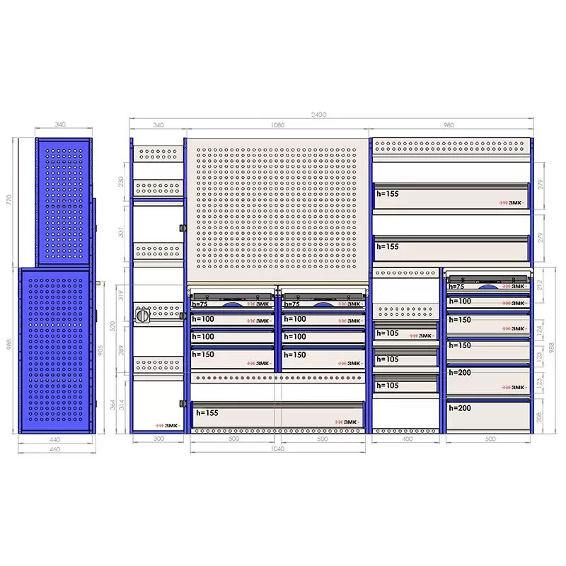 Комплект ЗМК 13.88.1758.2400.485 предназначен для комплексного оснащения сервисных автомобилей системой хранения инструмента с целью осуществления выездного сервиса, монтажа или ремонта. Используется в организациях, занимающихся ремонтом сельскохозяйственной и погрузочной техники, дорожно-ремонтных служб и других. Все элементы стеллажей изготовлены из высококачественной стали толщиной 1 мм. Рамы из профильной стальной трубы квадратного сечения 20х20 мм имеют порошковое полимерное покрытие синего цвета. Все выдвижные ящики, дверные блоки и откидные крышки оснащены специальными фиксаторами, которые не позволяют им выдвигаться и открываться при движении автомобиля. Шаг отверстий для крепления составляет 52 мм. Перфорированные стенки стеллажа позволяют фиксировать с помощью резиновых креплений вспомогательный инструмент или оборудование. Допустимая нагрузка на все ящики до 35 кг, на все полки до 50 кг, на столешницы до 100 кг. В комплект стеллажа входят все необходимые метизы, фиксаторы, кронштейны и усилители. Они поставляются в разобранном виде в надежной упаковке.