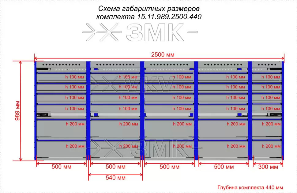 Комплект ЗМК 15.11.989.2500.440 предназначен для комплексного оснащения сервисных автомобилей системой хранения инструмента с целью осуществления выездного сервиса, монтажа или ремонта. Используется в организациях, занимающихся ремонтом сельскохозяйственной и погрузочной техники, дорожно-ремонтных служб и других. Все элементы стеллажей изготовлены из высококачественной стали толщиной 1 мм. Рамы из профильной стальной трубы квадратного сечения 20х20 мм имеют порошковое полимерное покрытие синего цвета. Все выдвижные ящики, дверные блоки и откидные крышки оснащены специальными фиксаторами, которые не позволяют им выдвигаться и открываться при движении автомобиля. Шаг отверстий для крепления составляет 52 мм. Перфорированные стенки стеллажа позволяют фиксировать с помощью резиновых креплений вспомогательный инструмент или оборудование. Допустимая нагрузка на все ящики до 35 кг, на все полки до 50 кг, на столешницы до 100 кг. В комплект стеллажа входят все необходимые метизы, фиксаторы, кронштейны и усилители. Они поставляются в разобранном виде в надежной упаковке.
