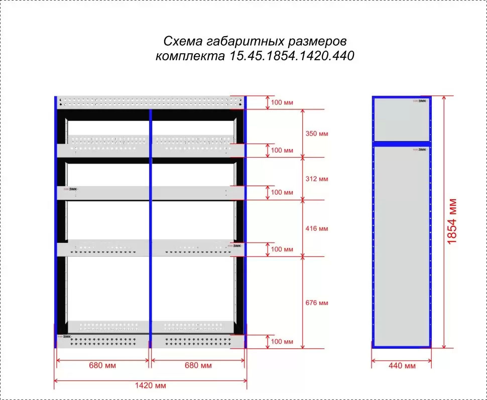 Комплект ЗМК 15.45.1854.1420.440 предназначен для комплексного оснащения сервисных автомобилей системой хранения инструмента с целью осуществления выездного сервиса, монтажа или ремонта. Используется в организациях, занимающихся ремонтом сельскохозяйственной и погрузочной техники, дорожно-ремонтных служб и других. Все элементы стеллажей изготовлены из высококачественной стали толщиной 1 мм. Рамы из профильной стальной трубы квадратного сечения 20х20 мм имеют порошковое полимерное покрытие синего цвета. Все выдвижные ящики, дверные блоки и откидные крышки оснащены специальными фиксаторами, которые не позволяют им выдвигаться и открываться при движении автомобиля. Шаг отверстий для крепления составляет 52 мм. Перфорированные стенки стеллажа позволяют фиксировать с помощью резиновых креплений вспомогательный инструмент или оборудование. Допустимая нагрузка на все ящики до 35 кг, на все полки до 50 кг, на столешницы до 100 кг. В комплект стеллажа входят все необходимые метизы, фиксаторы, кронштейны и усилители. Они поставляются в разобранном виде в надежной упаковке.