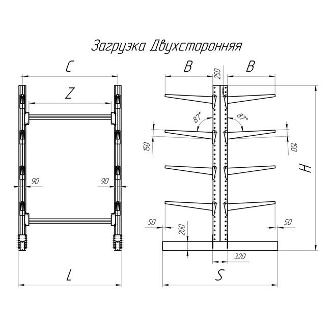 Стеллаж консольный островной металлический (C*S*H) 1500*2900*1500 мм имеет 1 ярус с нагрузкой до 1000 кг на 2 консоли.