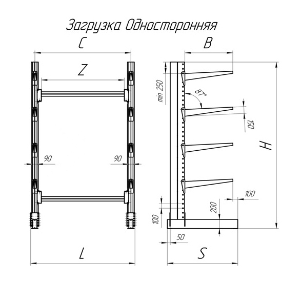 Стеллаж консольный металлический (C*S*H) 2000*1700*2500 мм имеет 3 яруса с нагрузкой до 1000 кг на 2 консоли.